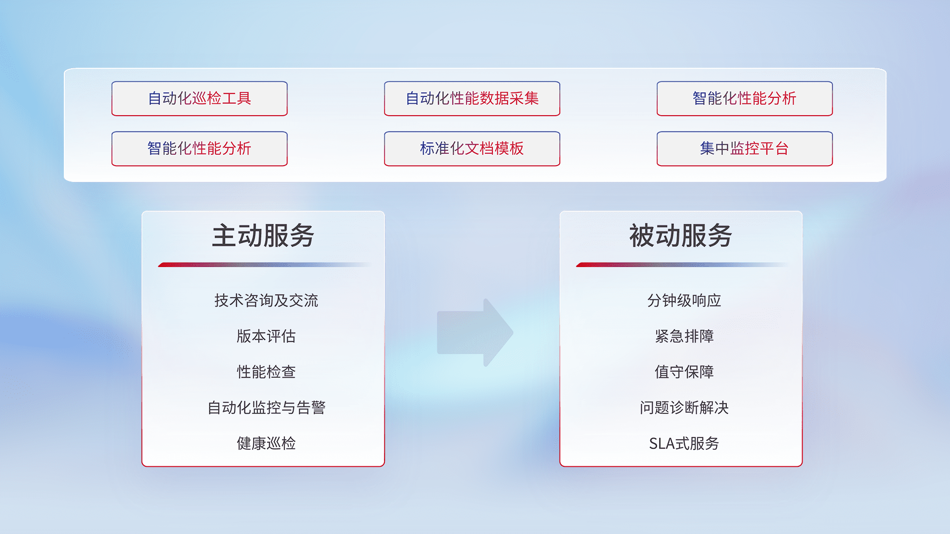 智能化工具和标准化文档,,,保障服务质量,,,,提供主动服务(包含技术咨询、、版本评估、、性能检查、、、自动化监控与告警、、健康巡检)和被动服务包含(分钟级响应、、、、紧急排障、、、值守保障、、、问题诊断解决、、、、SLA服务)。。。